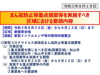 新型コロナウイルス感染症に関する「まん延防止等重点措置」の適用について 2021年8月19日 愛媛県は、8月20日より新型コロナウイルス感染症に関する「まん延防止等重点措置」が適用されますのでお知らせいたします。 PREV NEXT