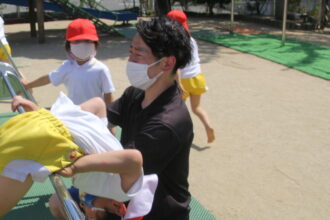 年長組は、晴れの日は外での活動で、暑い中、良く頑張りました。鉄棒→平均台→タイヤ跳び→登り棒のサーキット運動や、マットの側転、跳び箱の開脚跳び、鉄棒では逆上がりに挑戦をました。少しずつ年長さんらしさが出てきました。