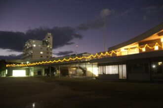 ライトアップされた、夜の園庭の木々をお楽しみください。
