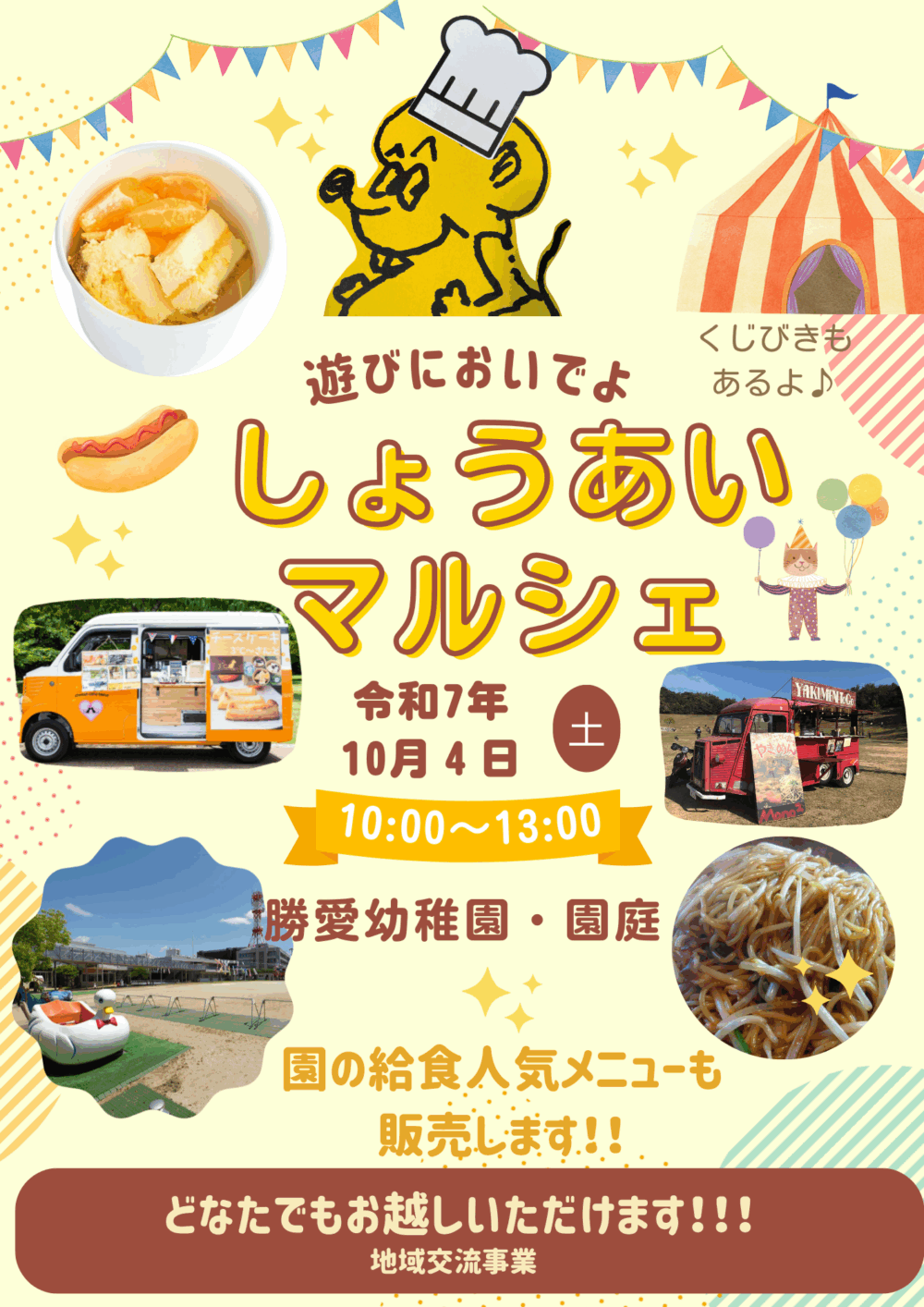 しょうあいマルシェ(地域交流事業)のご案内 2025年9月12日 10月4日(土)10:00~13:00 勝愛幼稚園 園庭において、「しょうあいマルシェ」を開催します。 キッチンカーや園の給食人気メニュー販売などを行います。 どなたでも参加いただけますので、ぜひお越しください。(自由参加・時間内園庭出入り自由) PREV NEXT