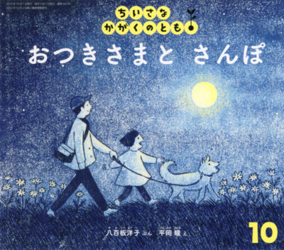 月刊誌「ちいさなかがくのとも」の10月号「おつきさまとさんぽ」。まず全編月夜をあらわすブルーがとても美しく魅了されます。おはなしの軸になっているのは、私も子どもの頃にとても不思議だった、自分が動くとお月さまも動く、お月さまがどこまでもついてくる!という感覚です。読みきかせの子どもたちももう感じているようでした。「車と一緒にずーっとついてきたんよ!」「止まるとお月さまも止まっとるんよ!」いろいろ教えてくれました。そんな感覚を「お月さまとお散歩する」と考えたら、なるほど、ちょっと見方がかわって、お月さまと友だちになったような、なんだか楽しい気持ちになります。