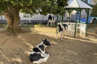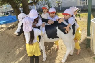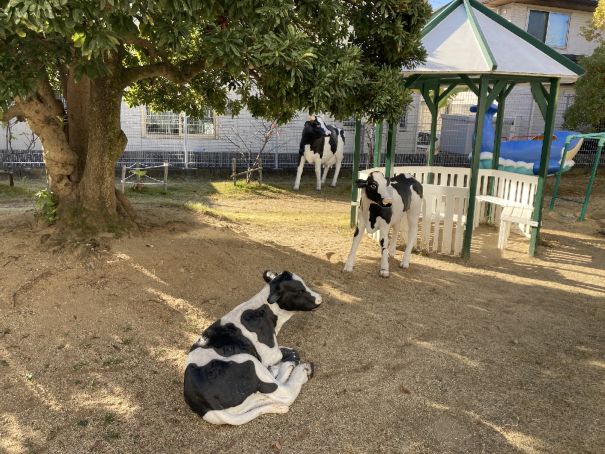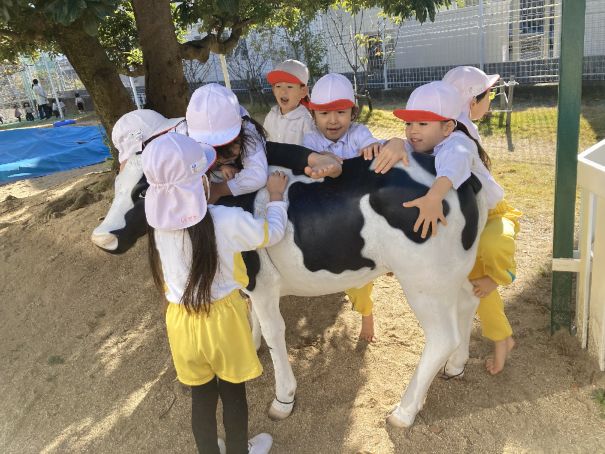 牛のモニュメント 2025年12月9日 12月9日の朝、西棟園庭に突然現れた3頭の牛に子どもたちはびっくりです。 小春日和の中、担任の先生に牛に乗せてもらったり、牛の体中をさわったり、牛に声をかけたりと大喜びしていました。 親牛、子牛、赤ちゃん牛、子どもたちと楽しく遊んで欲しいと願っています。 NEXT